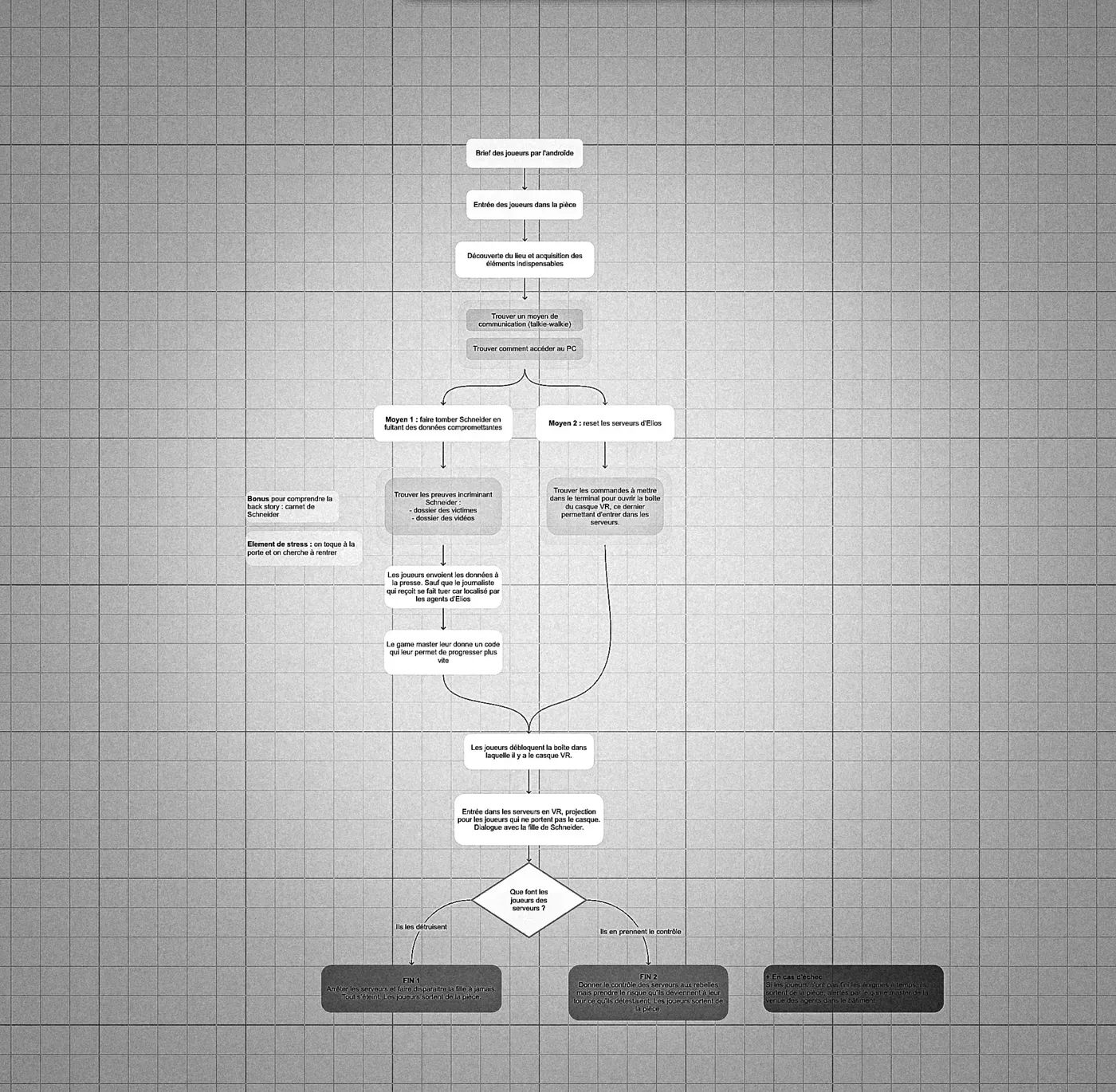 Mon projet de fin de BUT était la création d'un escape game. Le thème imposé : le temps. Nous devions choisir une période dans le passé ou dans le futur et créer une salle avec des énigmes autour de cela. Nous avons décidé de créer une expérience narrative et je me suis chargé d'écrire un scénario non-linéaire et à possibilités multiples.